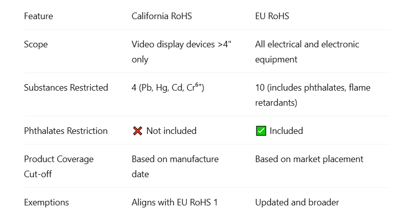 💡 TL;DR: California RoHS is more focused, less updated, but still enforced.